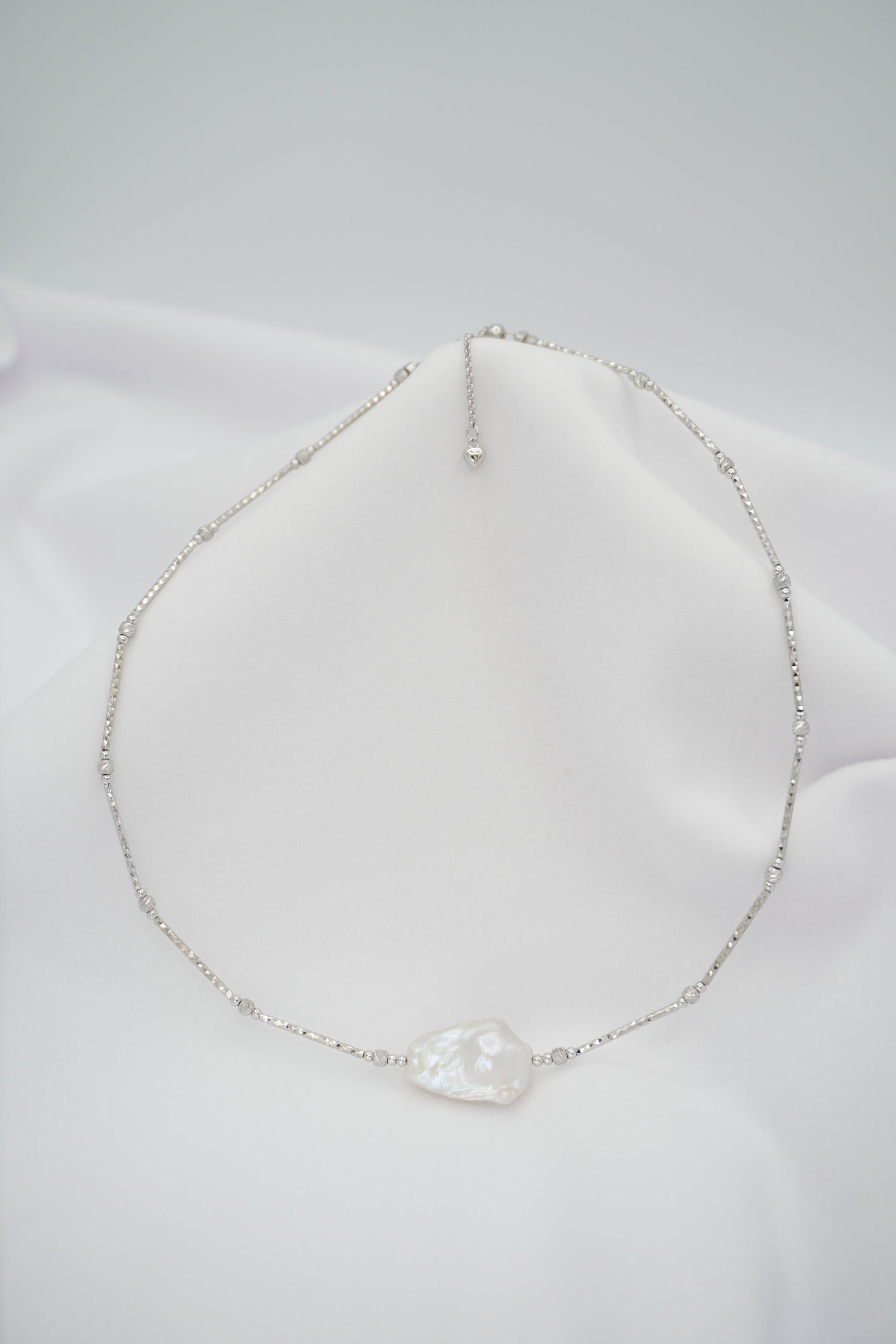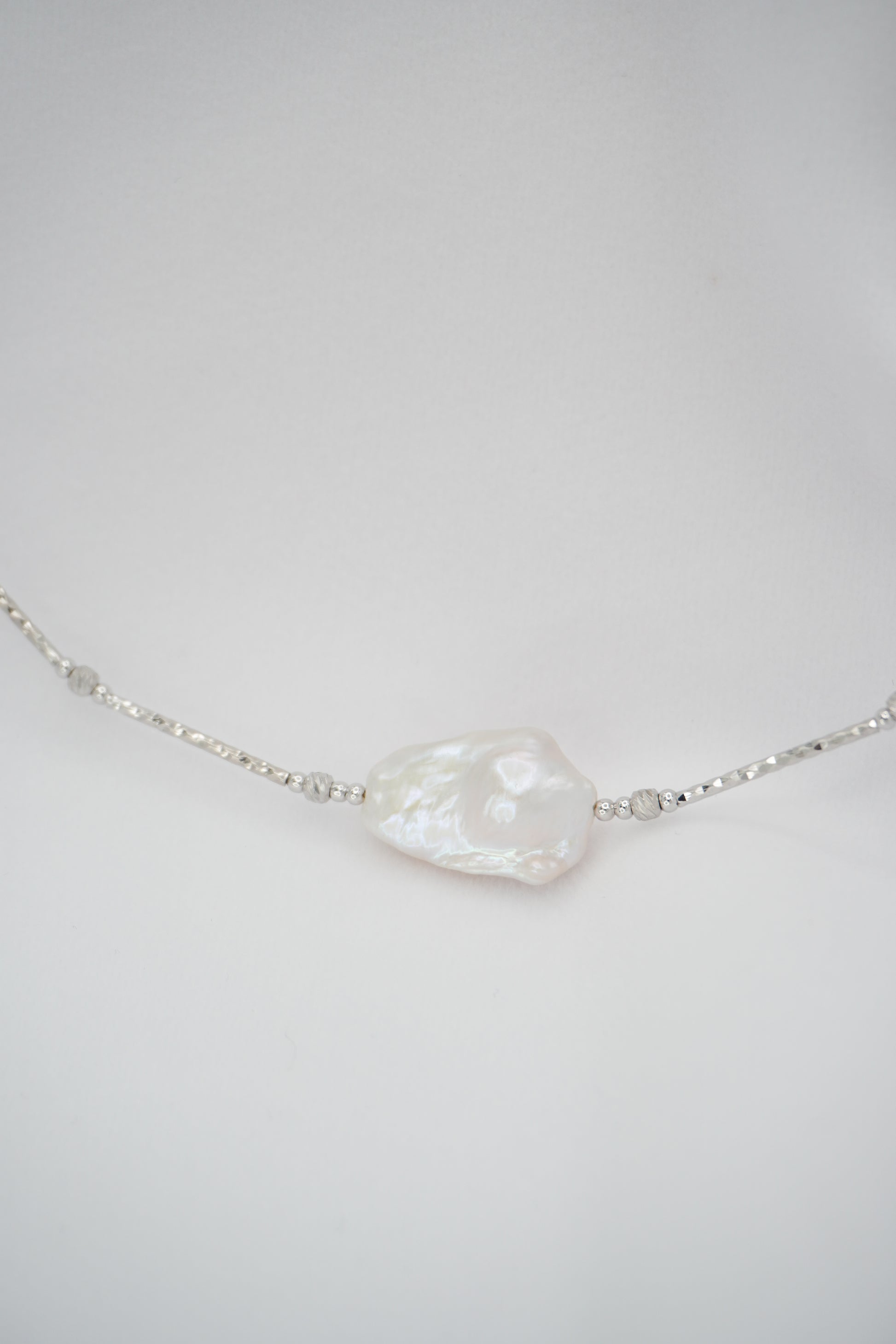 Freshwater baroque pearl & 18K white gold vermeil beads.